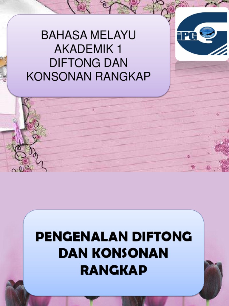 Diftong dan Vokal Rangkap 16 May 2012 1016 AM Munsyi Bahasa DIFTONG ialah gabungan dua bunyi vokal yang disebut secara berterusan satu hembusan nafas dan dalam penghasilannya terdapat ciri geluncuran. 9105 Kerja Kursus 50 Sepanjang Pentaksiran berasaskan sekolah Bahasa 17 semester bagi calon sekolah kerajaan. Dua huruf vokal itu melahirkan satu bunyi.